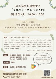 2025.08.19横須賀市保健所で「リカバリーカレッジ体験講座」が盛況のうちに終了しました。47名の方が参加され、「とてもリフレッシュできました」「アーリーメモリーを聞いて元気になりました」「人から元気をいただく幸せを再認識しました」「半年に1度でいいので、こういう講習・講座を開催して欲しい」などの嬉しい感想を […] -